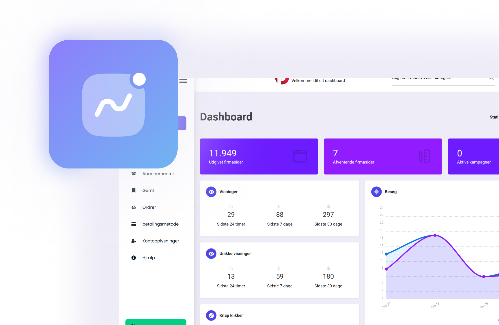 Opret din unikke firmaside for at få online eksponering og et personligt dashboard til at holde styr på dine resultater.