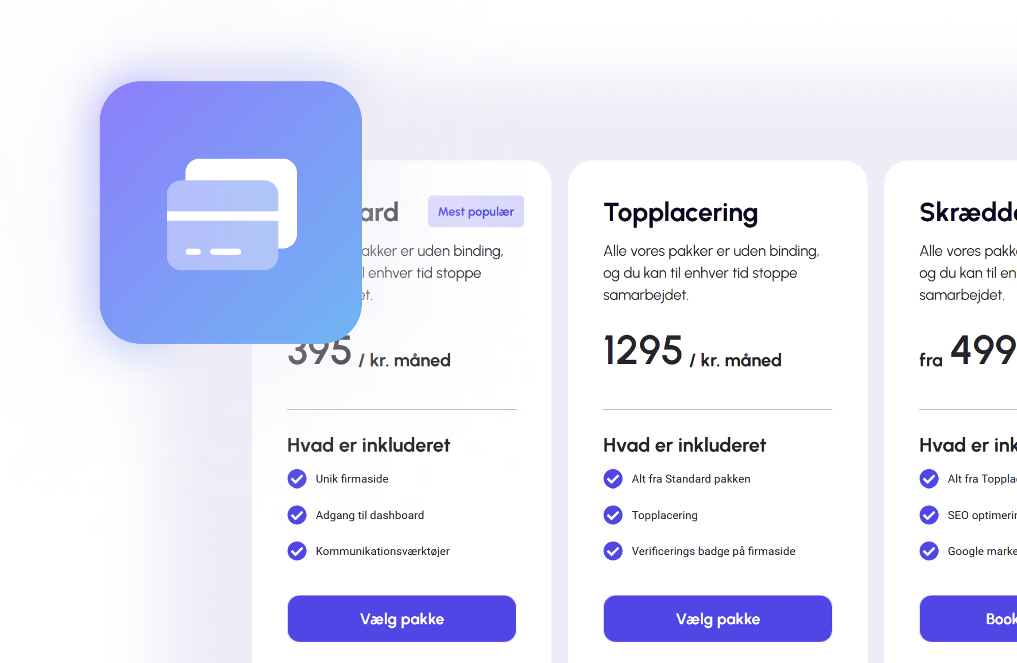 Vælg den pakke, der bedst matcher dit firmas behov. Vi tilbyder forskellige pakker, designet til at imødekomme forskellige krav og budgetter, så du kan finde en løsning, der passer til din virksomheds specifikke behov.
